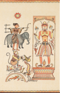 After all the living beings had received their lifespans, they set out on their journey back to their holes and burrows and nests and houses on Earth. On the way, Man met Monkey and Elephant. Man asked them, ‘Monkey and Elephant, how many years did each of you ask for and how many were you granted?’