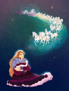 The North Star wished to marry Lindu and drove up to her father’s palace in a dusky coach drawn by six black horses. Adorned in a silver cloak and crown in shades of silver, he came bearing ten fine presents for Lindu and drove gracefully through the gates of Uko’s palace to ask for her hand.